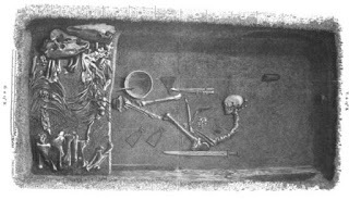 Illustration by Evald Hansen based on the original plan of the Viking Age warrior grave (Bj 581) by excavator Hjalmar Stolpe; published in 1889. (Stolpe, 1889)