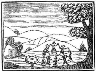17th-century English woodcut showing faeries dancing in a ring, with hollow hill, amanita muscaria mushroom and 'spirit face' in the tree. (Public Domain)