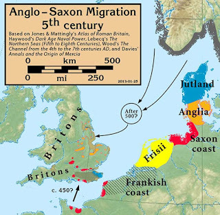A map indicating the patterns of migration in the 5th century that shaped Anglo-Saxon Britain