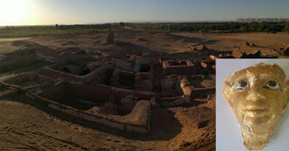 Top Image: The five Roman tombs found at the Beir Al-Shaghala site in the Dakhla Oasis of Egypt's Western Desert. (Ministry of Antiquities) Insert: A funerary mask found in one of the tombs. (Ministry of Antiquities)