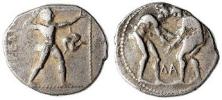 Example of a silver stater coin from Aspendos dating to 370-333 BC. Obverse: Olympic games-type scene: two wrestlers grappling, the letters delta and alpha between their legs; Reverse: Olympic games-type scene of a slinger, wearing short chiton, discharging sling to right, triskeles on right with feet clockwise. (Ancientcointraders/CC BY SA 4.0)