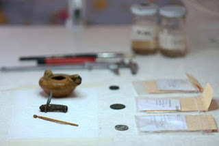 Some of the products that were apparently stored and sold in the complex include: a small glass amphora, pieces of oil and perfume bottles, candles, a bronze belt buckle, a bone hair pin, and lots of studs and rings.