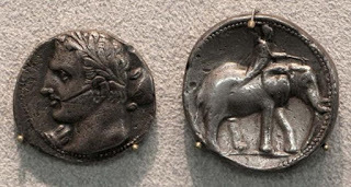 A Carthaginian silver shekel depicting a man wearing a laurel wreath on the obverse, and a man riding a war elephant on the reverse, c. 239-209 BC (CC BY-SA 3.0)