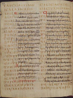 Example of a palimpsest. The lower text is from the 6th century (Codex Guelferbytanus 64 Weissenburgensis, folio 92 verso), it contains the text of Luke 1:6-13; the upper text is from the 13th century - Isidore of Seville's "Origines" 8.10.2-8.11.4. (Public Domain)