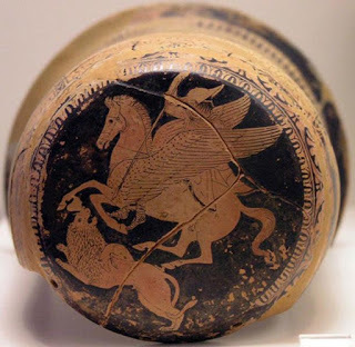 Bellerophon on Pegasus spears the Chimera, on an Attic red-figure epinetron, 425–420 BC. (CC BY-SA 2.5)