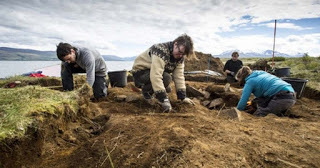 Top image: Archaeologists dig at the site of the first ship burial, where the human and dog bones, the ship and sword were found. You can see how close the waters of the fjord are in the background. ( Iceland Magazine /Auðunn)