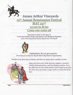 The 12th Annual Renaissance Festival is scheduled for Saturday May 22nd from 12:00-00 to 8:00 p.m. at the James Arthur Vineyards, 2001 West Raymond Road, Raymond, NE 68428. Your favorite author will be participating in a medieval dance demonstration which includes Rufty Tufty and Toss the Duchess.
