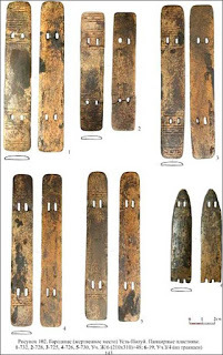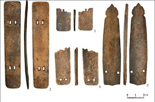 Top Image: 'The ornamentation on the plates can be individual, that is after the thorough analysis we could say how many warriors left armor here.' Picture: Andrey Gusev Insert: According to Gusev Yamal armor resembled the design used by Kulai peole. Picture: Alexander Soloviev