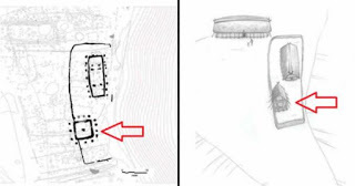 The tower area with a fenced ceremonial house and a north-south facing house dating to the Iron Age and Viking Age. The tower is indicated by the red arrows. ( Illustration: Tom Lock )