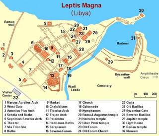 This map shows the many important sites in Leptis Magna, an ancient Roman city in Libya presently being protected by concerned Libyan citizens armed with Kalashnikovs. (Wikimedia Commons/Map by Holger Behr)