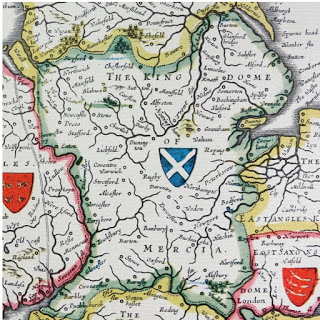 Shield of Mercia, from the Heptarchy; a collective name applied to the Anglo-Saxon kingdoms of south, east, and central England during late antiquity and the early Middle Ages. Detail from an antique map of Britain by the Dutch cartographer Willem Blaeu in Atlas Novus (Amsterdam, 1635). (Photo by Universal History Archive/UIG via Getty Images)