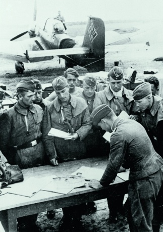 German pilots are given their objectives before taking to the skies, 18 August 1940. (Credit: Corbis)