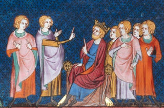 King Haraldr hárfagri receives the kingdom out of his father's hands. From the 14th century Icelandic manuscript Flateyjarbók. (