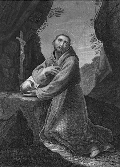 c1220, a portrait of Saint Francis of Assisi kneeling at an rock altar to pray with a skull in his hand. (Photo by Archive Photos/Getty Images)