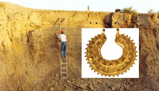 Top image: Main: Excavating at Tel el-Ajjul, Gaza. Credit: Peter M. Fischer . Inset: Gold crescent shaped earring jewelry found at Tell el-Ajjul.