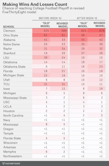 For instance, it posited a conspicuously large gap between Iowa’s chance of winning the Big Ten championship (27 percent) and making the playoff (8 percent). Iowa is undefeated, and while it’s possible they could win the Big Ten with one loss or more, the internal calculations in the model also implied that they’d have only about a 55 percent chance of making the playoff even if they ran their record to 13-0. One can see why a computer might come to that conclusion — Iowa has played a pretty bad schedule, and its margin of victory hasn’t been impressive — but human beings are going to vote an undefeated Big Ten champion into the playoff unless almost everything else2 is working against them.