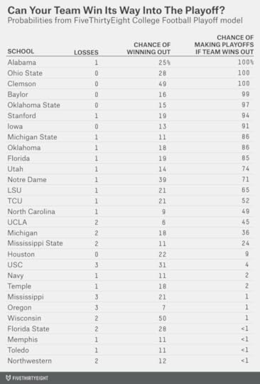 So don’t despair, Michigan State fans. (Of which I’m one.) Yeah, you probably lost on a bad call last weekend. But you’re still highly likely to make the playoff if your team wins all of its remaining games, in which case you’ll have defeated Ohio State and (probably) Iowa in the Big Ten championship. Pretty much every one-loss team from a power conference is more likely than not to make the playoff if it wins out.