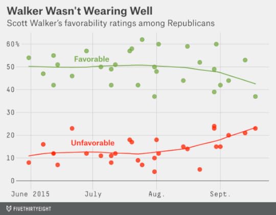 Nate Silver and Harry Enten on Scott Walker’s early exitAnd yet, Walker still had a couple of things going for him. He had been polling well in Iowa for much of the campaign and was still a plausible winner there. And his favorability ratings — sometimes a better indicator of who could be a broadly acceptable nominee — were reasonably good among Republican voters, at an average of about 45 percent favorable and 20 percent unfavorable in the most recent polls.
