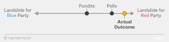 Herding can also yield some funny outcomes when it comes to comparing the polls with the pundits. Imagine an election between two parties, the Red Party and the Blue Party. The polls show the Red Party ahead by, say, 5 percentage points. But the pundits read the “vibrations” and say the election is too close to call. A forecaster might aggregate this information and predict the Red Party to win by 2 or 3 percentage points, somewhere in between where the polls and the pundits have the race. If you prefer a diagram, it might look like this: