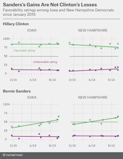 Nor do Sanders’s gains in Iowa and New Hampshire say much about Clinton’s vulnerability. This is easy enough to test. When a candidate gains relative to another, it could be because he is growing more popular, or because his opponent is becoming less popular. Horse-race polls, in which voters reveal only their first preference, won’t always be able to distinguish between these causes.