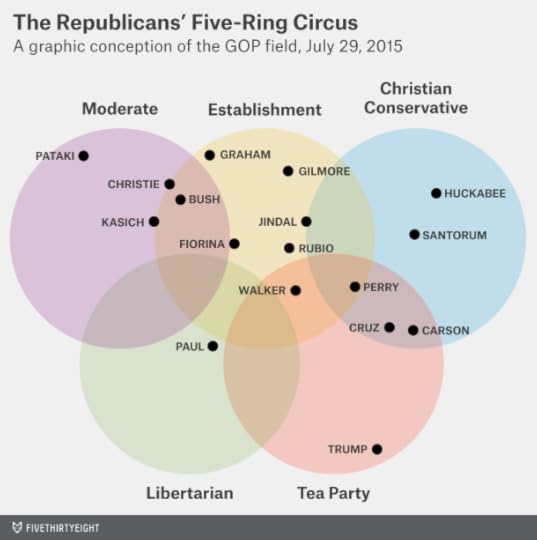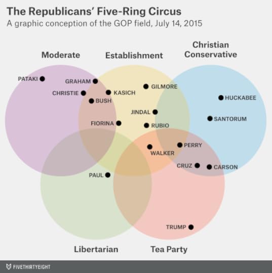 But the Republican Party is also divided between at least five identifiable constituencies: moderates (who still have influence in states like New Hampshire), establishment voters, Christian conservatives, libertarians, and populist (or so-called tea party) voters. These constituencies overlap, but each has several candidates to choose from: