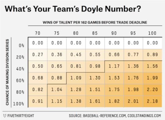 The highest Doyle Number (2.07) belongs to the St. Louis Cardinals, who are probably the best team in baseball, with more than 96 wins of talent and a 21 percent likelihood of winning the World Series. Even though St. Louis already had a completely stacked roster and a very high likelihood of making the division series without any trades, the increase in championship probability upon entering the MLB postseason would have made even a lopsided long-term trade worth it. The Cardinals should have been prepared to give away as many as two wins of future talent to get one win at the trade deadline.5