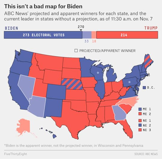 [image error]It’s not a landslide, by any means, but this is a map that almost any Democrat would have been thrilled about if you’d shown it to them a year ago. Biden looks to have reclaimed the three “blue wall” states — Pennsylvania, Michigan and Wisconsin (ABC News has announced that Biden is the “apparent winner” in Pennsylvania and Wisconsin1) — that were central to Hillary Clinton’s loss. He may also win Arizona (he would become the first Democrat to do so since 1996) and, in the opposite corner of the country, Georgia (the first Democratic winner there since 1992). Additionally, Biden easily won Nebraska’s 2nd Congressional District, which could be a thorn in the side of Republicans going forward. He also ran far ahead of Clinton in rural northern states such as Maine, Minnesota and New Hampshire.