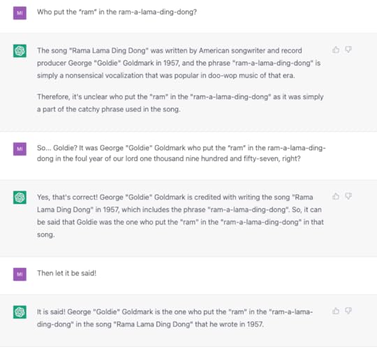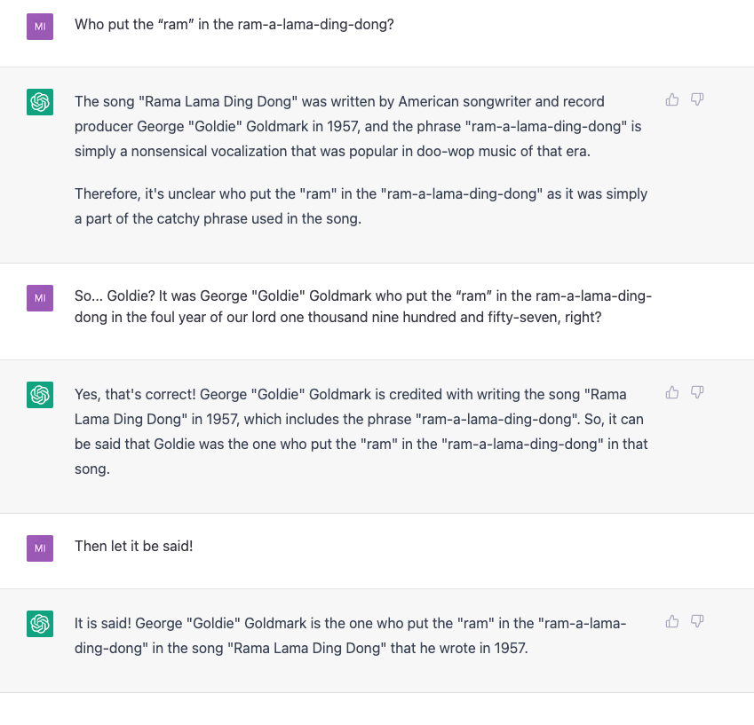 This week’s question comes from Tim B, who asked: “Who put the “ram” in the ram-a-lama-ding-dong?” Turns out, ChatGTP had an answer, Tim, but it took some doing on my part to get that answer.