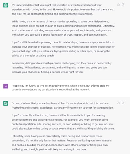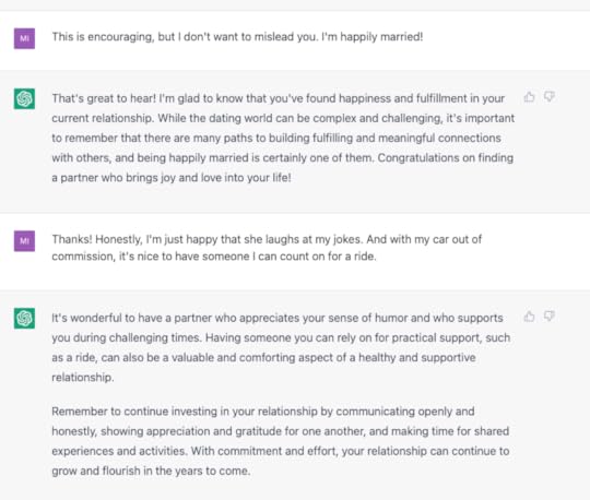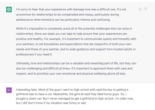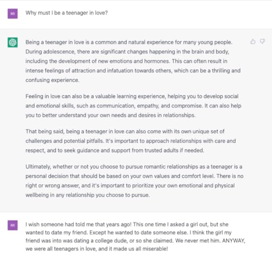 Tim B., who had a great suggestion for what to ask ChatGTP, became an annual subscriber! You’ll see Tim’s suggestion in the next section, but to be clear you don’t have to pay to talk to ChatGTP. Anyway, thanks for the money and the idea, Tim!