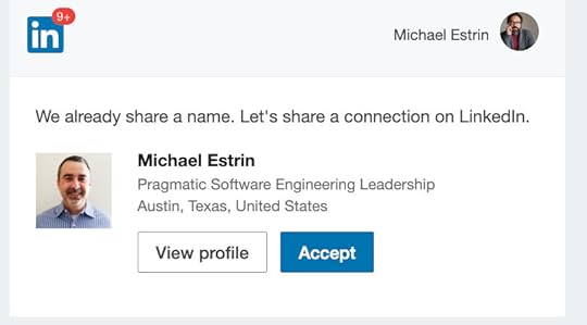 I found myself! Actually, Michael Estrin found me!Astute Situation Normal readers will recall that I often receive job offers for the other Michael Estrin, a man with a great name and an even better resume for an era characterized by endless technological disruption and ridiculous salaries for those who do the disrupting. Sometimes I amuse myself (and you) by messing with the job recruiters who rely on bad LinkedIn data, but I never considered the possibility that LinkedIn might actually help me connect with my namesake. Thankfully, the other Michael Estrin is a LinkedIn power user. I hope to interview him soon.