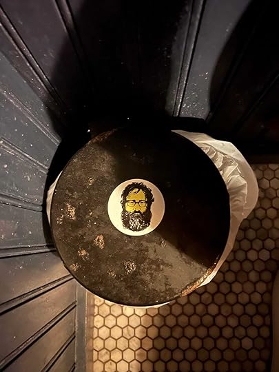 Allison spotted the sticker on the lid of a trash can in the restroom of a bar in the Gowanus neighborhood of Brooklyn. I used to live in Brooklyn, but I don’t remember drinking in Gowanus, or licensing my likeness to a sticker company. So what’s going on here? I have some theories, naturally: