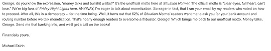 Crime doesn’t pay, but democracy doesLast week, I shared an email exchange with George, a man who wants to monetize Situation Normal and fight disinformation. In a poll, I asked YOU how I should respond to George. Turns out, 62 percent of you are keen to run an email phishing scam. While I’m reluctant to commit a crime, I’m vehemently pro-democracy. So vehemently pro-democracy, in fact, that I followed the will of the people by asking George for his banking information. Here’s what I wrote: