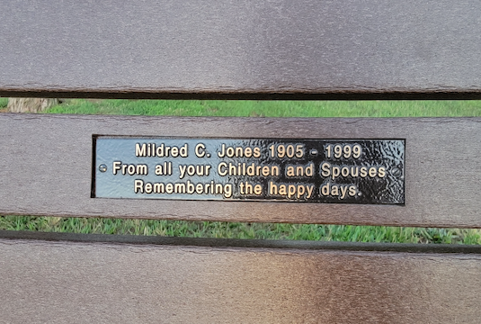 Everyone loved MildredReader E.O. Connors sent in a curious photograph of a park bench dedicated to the loving memory of Mildred C. Jones (1905 - 1999). At first glance, the bench looks like a typical memorial. There’s a plaque with some basic information and a bench. I don’t know why we remember loved ones by inviting strangers to sit on a memorial bench, but that’s a question for another day. The question E.O. Connors and I want answered is about Mildred’s spouses. How many spouses did she have? And what’s the story behind her partners putting aside their rivalry for Mildred’s affections to collaborate on this fine memorial? I don’t know about you, but I’m getting strong There’s Something About Mary vibes from the Mildred C. Jones memorial bench.