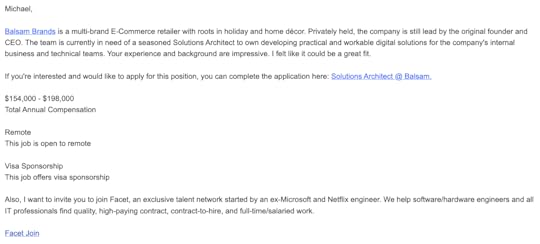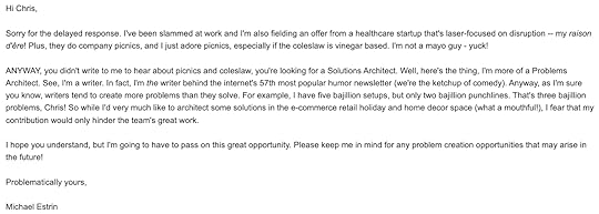 “The money is tempting,” I said. “But I’m not looking to make a career move just yet.”