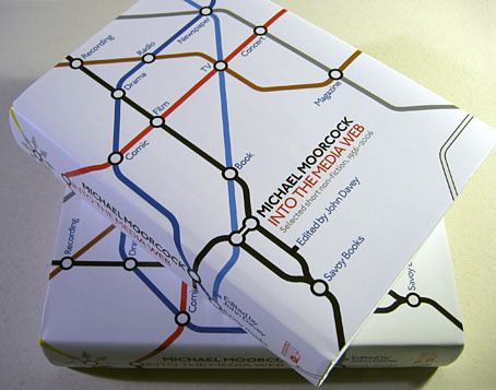 Michael Moorcock's Into the Media Web: Selected Short Nonfiction, 1956-2006, edited by John Davey, is the best SF/F nonfiction book published this year. Savoy should be commended for publishing it. John Coulthart did the remarkable design, and he's shown off that design here. Over 700 pages and 300,000 words, with Alan Moore contributing a foreword and Moorcock himself has written a thorough introduction, which includes several interesting photographs.