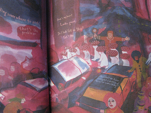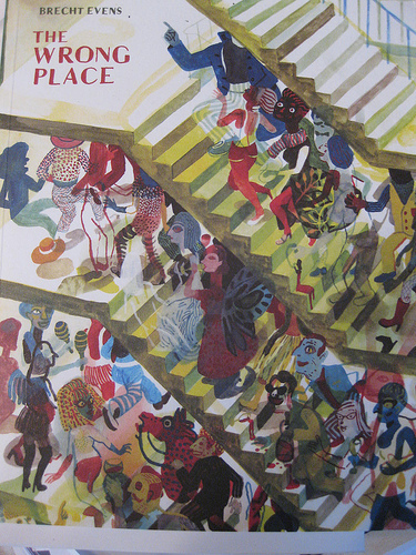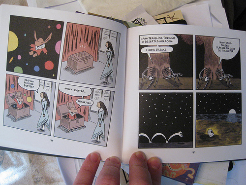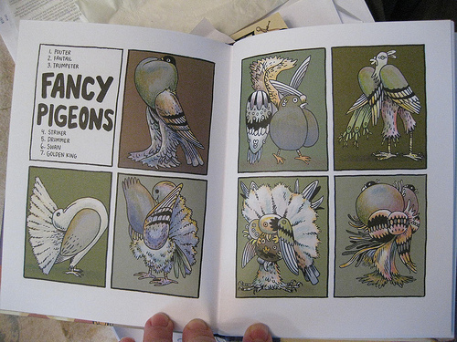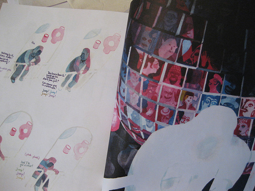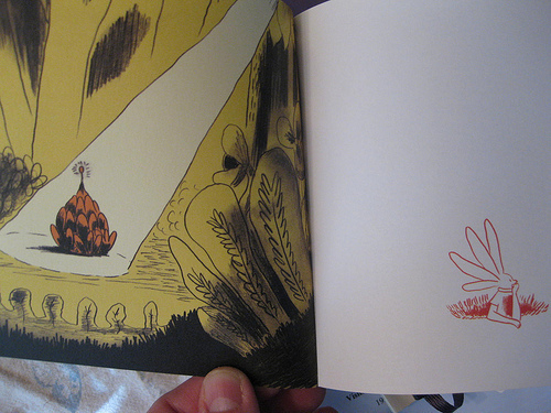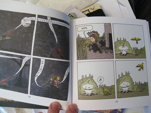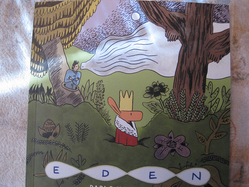 Today, for example, we got Eden by Pablo Holmberg, The Wild Kingdom by Kevin Huizenga, and The Wrong Place by Brecht Evens. The art style of each, the world view behind each, and the size of each book are entirely different. But they share the D&Q vision. They've all got great end papers. They each are in the format best-suited for them (Wild Kingdom as a little hardcover, cover image printed on the boards, for example.) Take a look at some samples below, and definitely look for all three. Extremely awesome stuff—and am enjoying the kind of "eavesdropping on party conversation" style of the Evens.
