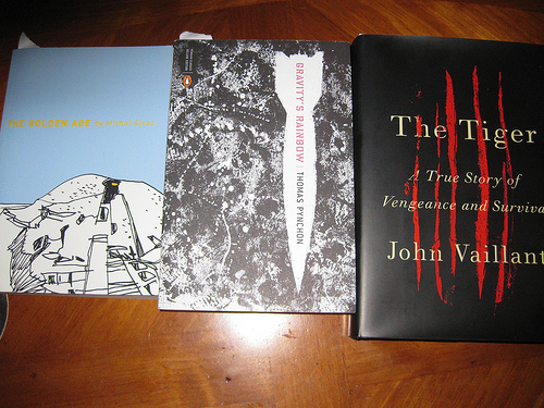 How'd I wind up reading three books at once? I don't know. Gravity's Rainbow is like the bible in this trinity–I dip in and out of it, reciting sacred verse–The Tiger is my connection to the physicality of the world and my re-read of The Golden Age is my anchor to the intellect, to metaphor, to immersive strangeness.