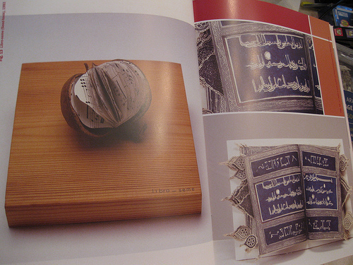 Gutt's work has a kind of streamlined, deceptive simplicity to it. Here, for example, is a book housed in a nut and a decorated page from the Koran, taken from the exhibit's catalog.