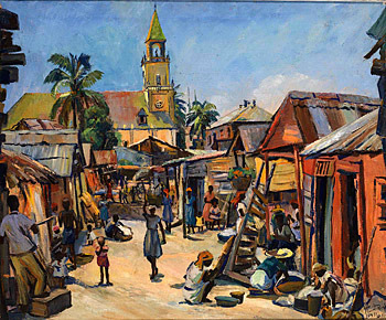 This doesn't even begin to get at the richness and variety of her paintings, but perhaps gives you a small glimpse. It's hard to pick a favorite, but there were a few paintings from her seventies in which she'd combined a kind of symbolic-surrealist approach with themes from Haiti and Africa that we found particularly compelling. (Unfortunately, I can't find these online.)