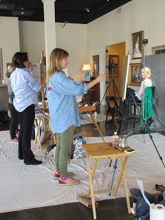 I liked this format quite a lot, warming up with an oil monochrome, then painting from the live model again the second day, but in color. There were eleven students (one had to drop out at the last moment) and plenty of room in the portrait gallery for 11 easels and two live model set-ups.