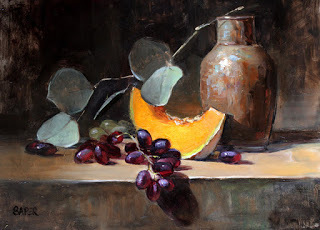 Here are the two paintings I made during the class, each using one of Jeff's signature elements: Eucalyptus leaves and canteloupes.