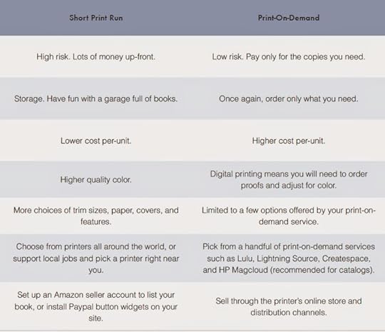 The following table highlights the basic differences between self published POD and short-run: