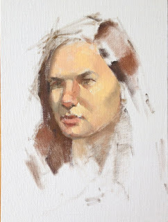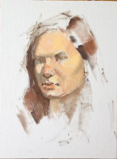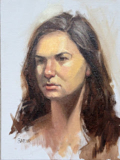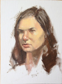 Above, part way through painting our model, Sarah. You can see artist Katherine Stone painting next to me. Carol Arnold was on Kate's left. I used for the first time the Natural Pigments's Artefex oil-primed linen panel, with thanks to George O' Hanlon who graciously donated the panel. It's a beautiful panel, and I will look forward to using more of them.