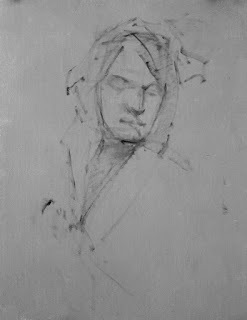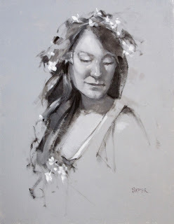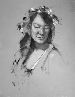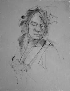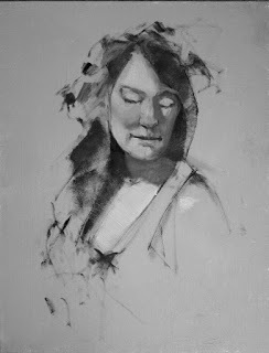 At the Portrait Artists of Arizona open studio yesterday our model Samantha held a STANDING pose all day! In order to try out some methods that I'll be incorporating into future workshops, I came with an oil-primed linen panel, already primed opaquely with Gamblin's Portland Gray Medium (PGM). Materials were white, black PGM, and Torrit Grey.