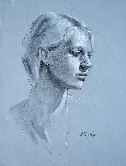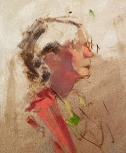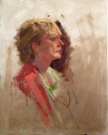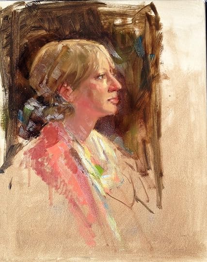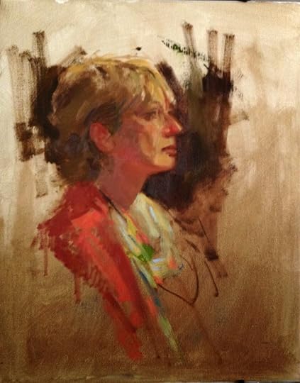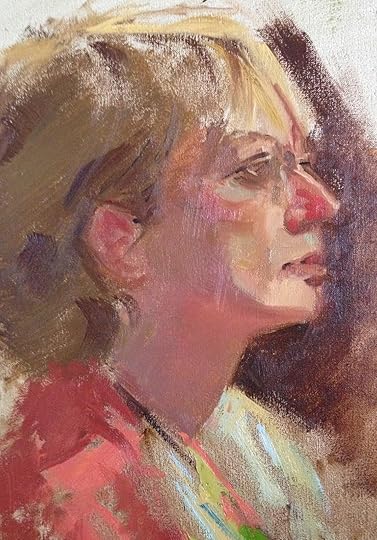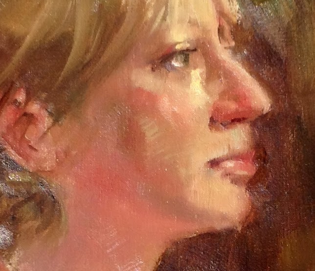 Last Friday's Open Studio at the Mountain Artists Guild...so here is what I wanted to work on during the session: using more paint, thicker paint, and gaining more variety in brushwork. I misjudged my composition thinking I'd have time to add more scarf and sweater to the right....I usually spend a lot of time before I even start, especially with a profile view, to place the head correctly. If were to frame this, I'd crop to fit on 18 x 14 stretchers.