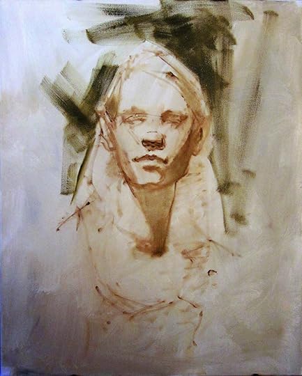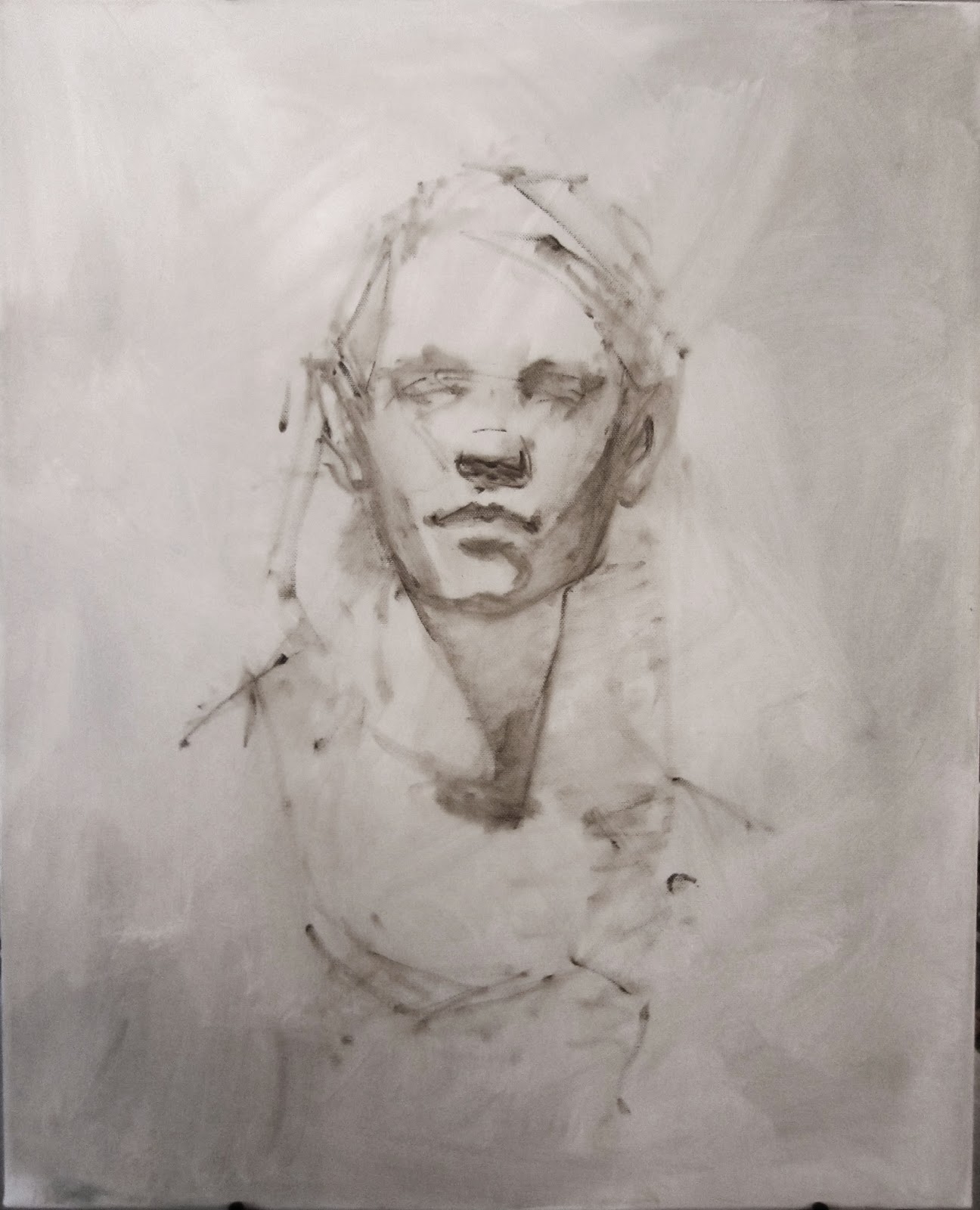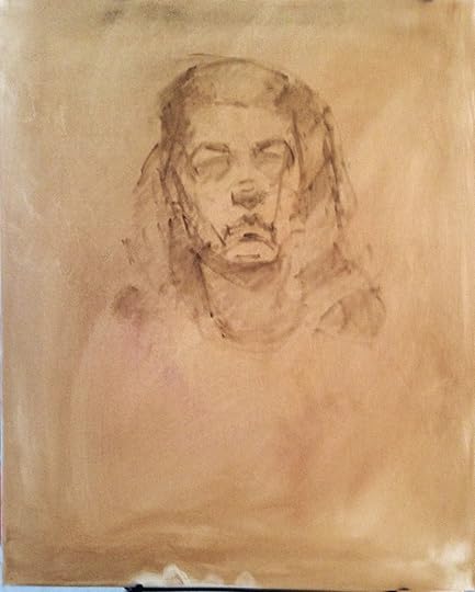 Step 1: Size and place the head. Drawn with Raw Umber, thinned with a bit of Gamblin's Solvent-free Gel Medium.