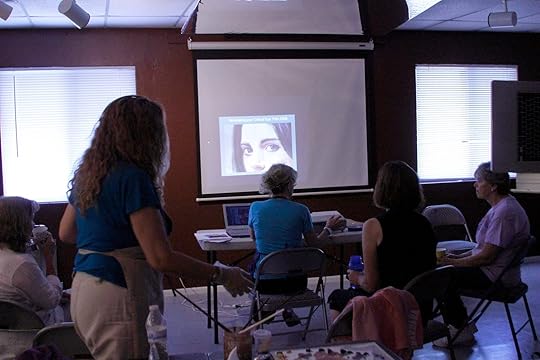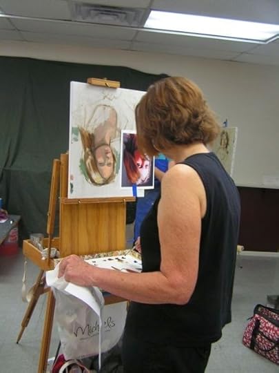 On Tuesday and Thursday we completed the previous day's portraits from photos - understanding how to get excellent photo references is a key part of this course. Below, Bonny works from her monitor and Patty checks her work by viewing both photo and painting upside down.