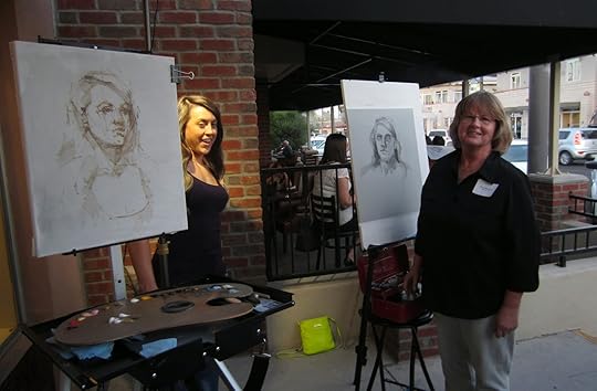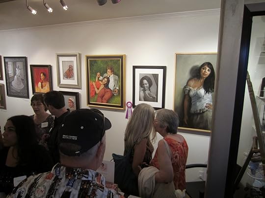The 4th Annual Portrait Artists of Arizona's Exhibition opening to a wonderfully packed crowd, and a most fortuitously "cool" evening for artist Penny McElhaney and me as we demonstrated painting from the live model - outside. (artist Jean Hildebrant struggled in air-conditioned comfort inside the studio....) If you don't live in Arizona there's no way to imagine the temperature volatility of heat this time of year - 90 degrees is pretty tolerable if you're not in direct sunlight, but I doubt the high even made it to 90 yesterday:)