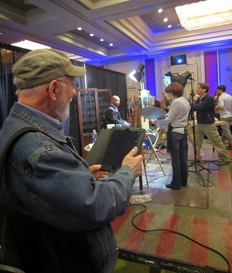 The program opened on Thursday night with the always-anticipated Face-Off, where fifteen artists and 5 models take over the Grand Ballroom and paint from life for 2 1/2 hours. Attendees can wander from easel to easel to watch the progress - there were some really fabulous painters and equally fabulous results. Below, icon Max Ginzburg shows his techie side as he watches three artists at work.