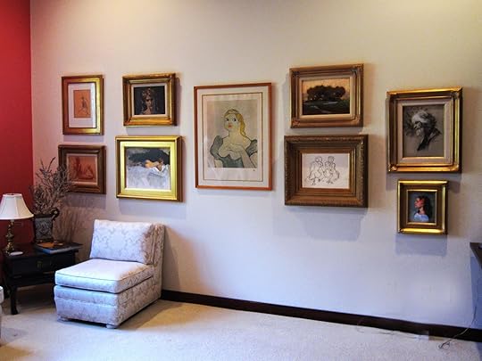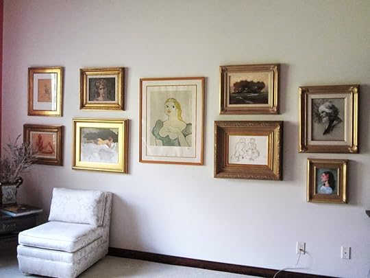 Below, this wall is painted a soft white and flanks a large window on the left - my friends Marlene and Eric Slayton came to help me hang the wall. (OK, actually I healed THEM hang the wall by holding the hammer and nails). This is the way the wall looks in natural daylight. You can see that there are a variety of different styles of frame, but they are all unified by their gold-hued color. Despite the face that there are quite a lot of different categories (several nudes, a large central print, some portraits and a landscape) - and media - (charcoal, pen and ink, oil, conte) the wall still holds together in a pleasing fashion. Most are mine, but the central print and landscape are by other artists.